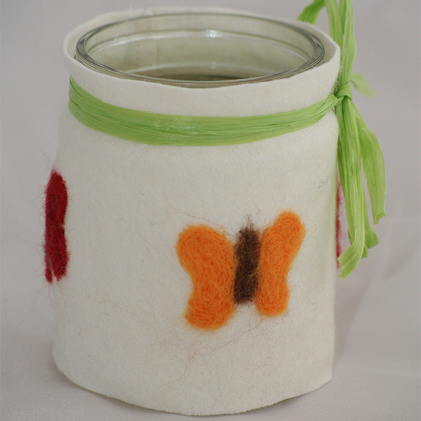 Windlicht mit Filzschmetterlingen auf Filzstoff